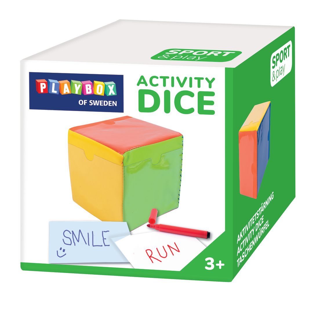 Colorful activity cube with transparent pockets on the side. The activity cube provides endless possibilities for creating educational tasks and games for the children. Write notes with different activities and put them in the pockets, for example jumping like a frog or twisting like a snake. The cube is made of foam so that it does not make a sound when it hits the floor. - Dimensions: 15x15x15cm, - Colors: green, orange, purple, red, yellow, and blue - Materials PU and EVA - PVC-free
