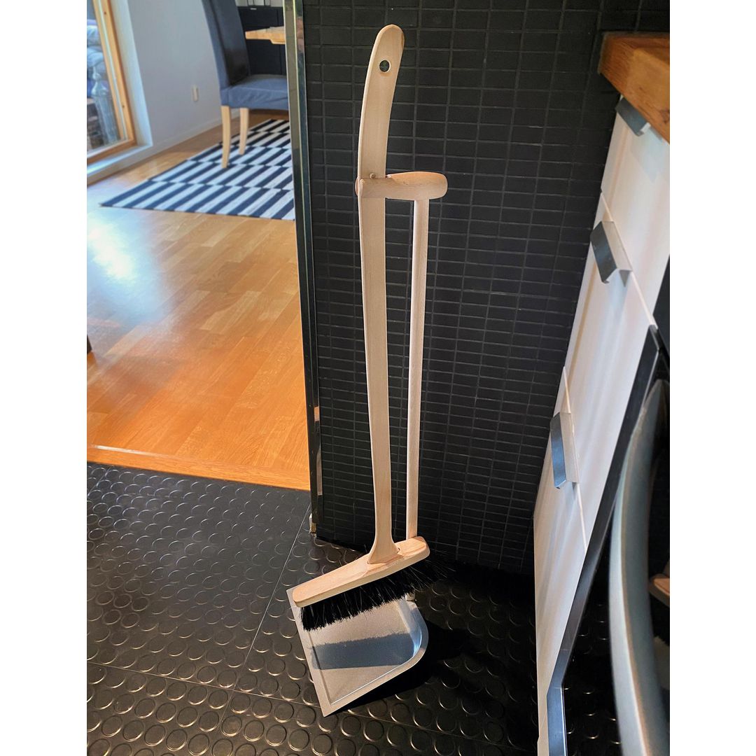 Stylish wooden garbage can with metal shovel. Suspension for the brush. Brush in horsetail mixture.