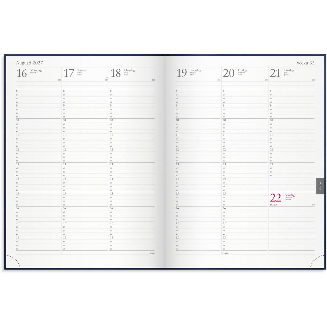Calendar 2027 from Burde. Format: 195x260 mm. Layout: Portrait. Week/spread. Quarter division 8-19. Calendar: 2025-12-29 - 2027-01-03. Cover: Artificial leather. Hardcover. Details: Marking ribbon. Contents: Church holidays, Flag days, Holidays/evenings, International holidays, Moon phases, Name days, International holidays overview, Theme days/evenings, Year overview/year overviews, Year plan/year plans. Number of pages: 112. Environmental information: FSC®.